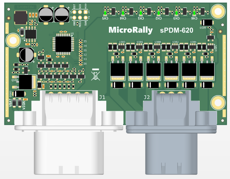 Programmable solid state PDM with 6 input and 6 output channels. Capable of 20A total current. 2 High current outputs and 4 medium current outputs. All inputs are digital 5V inputs with embedded pull-up resistor. All outputs channels have current sense.